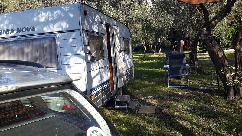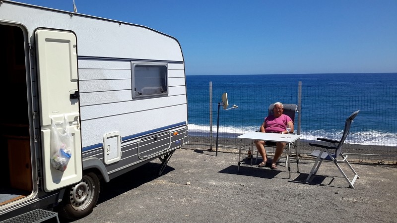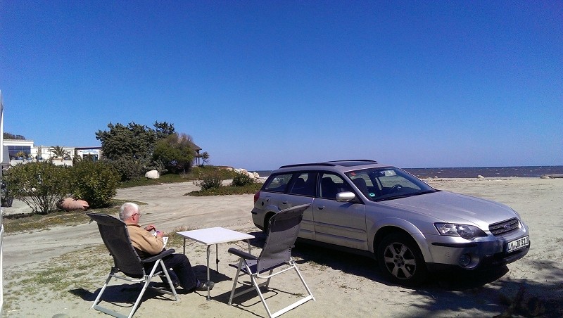 Nun sitzen wir aber erstmal vor dem Wohnwagen und genießen diesen schönen Platz. Sagte ich schon, dass er direkt am Meer liegt? Wlan gibt’s leider nicht kostenlos, aber für 1 Euro am Tag top Verbindung. Also wir sitzen und genießen, da kommt ein Italiener mit seiner Rostlaube (wir sehen ihn zwar nicht, aber hören ihn), Fenster runter und Musik auf vollster Dezibelstärke. Kannste glauben, was der Göga geschimpft hat, natürlich schön leise hinter unserem Wowa.